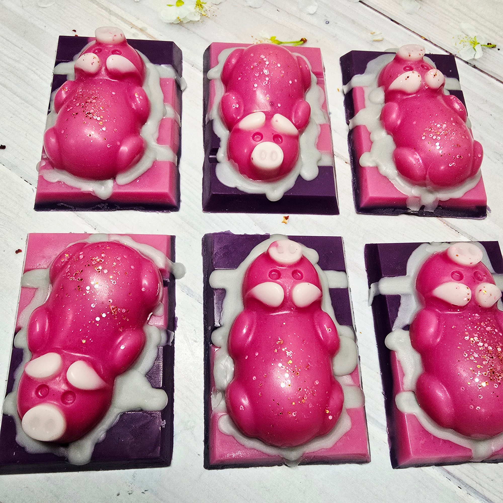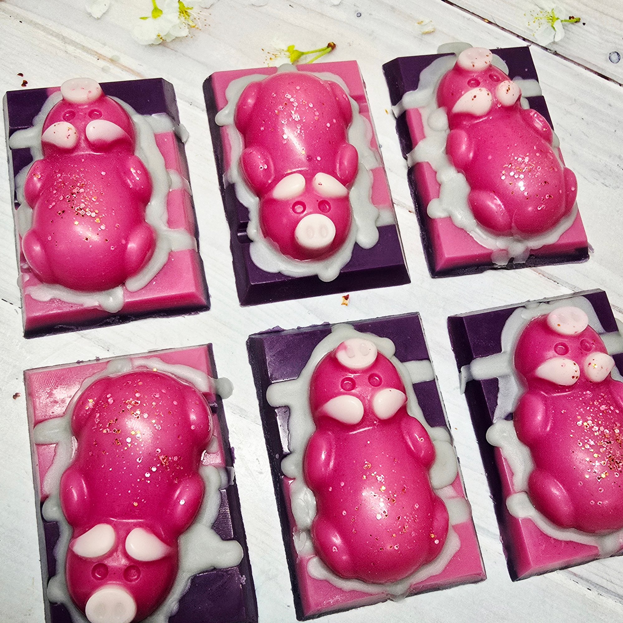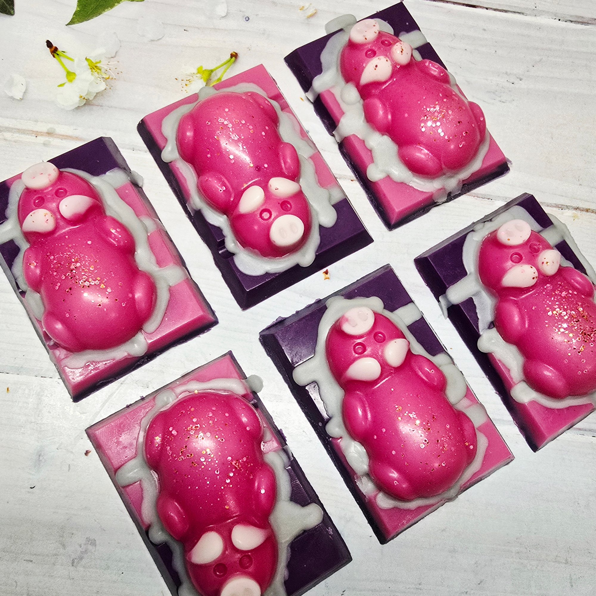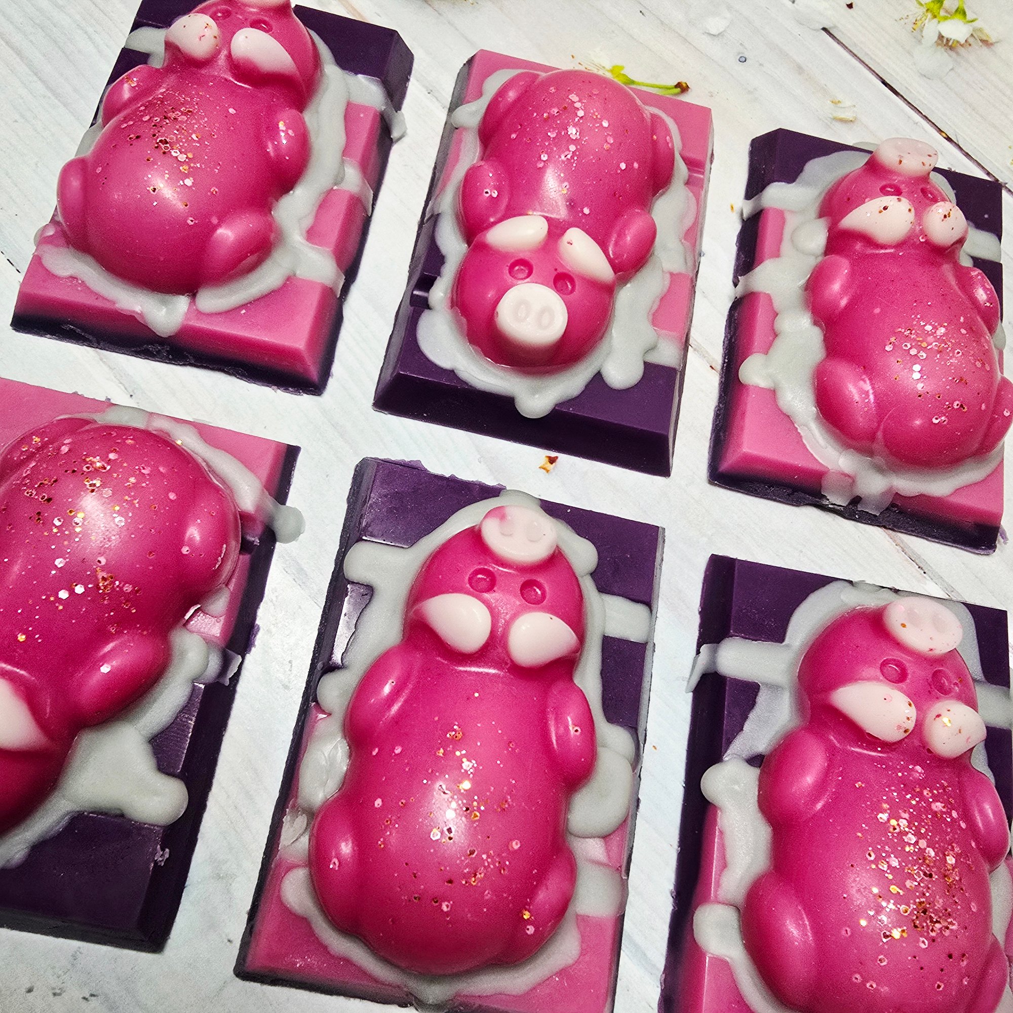 A cute piggy topped on a mini snap bar. Approx 45g.