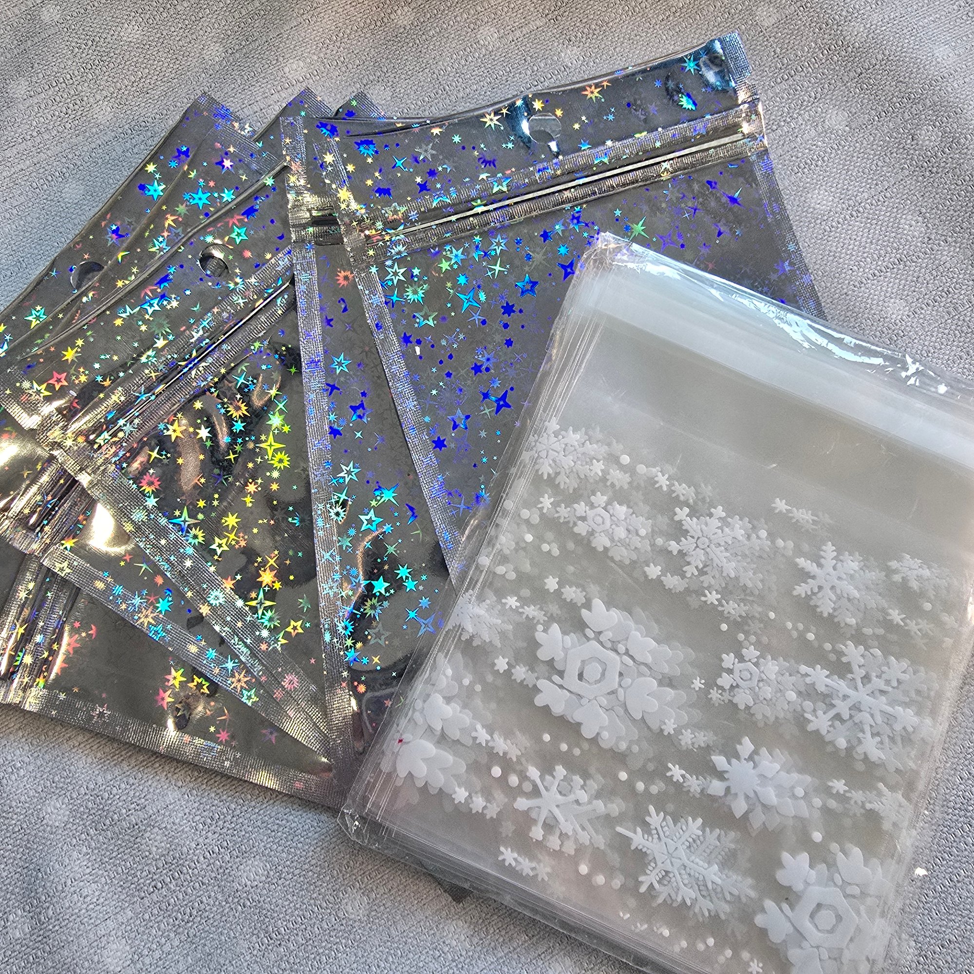 60 snowflake cello bags & 7 holographic star resealable mylar bag bundle