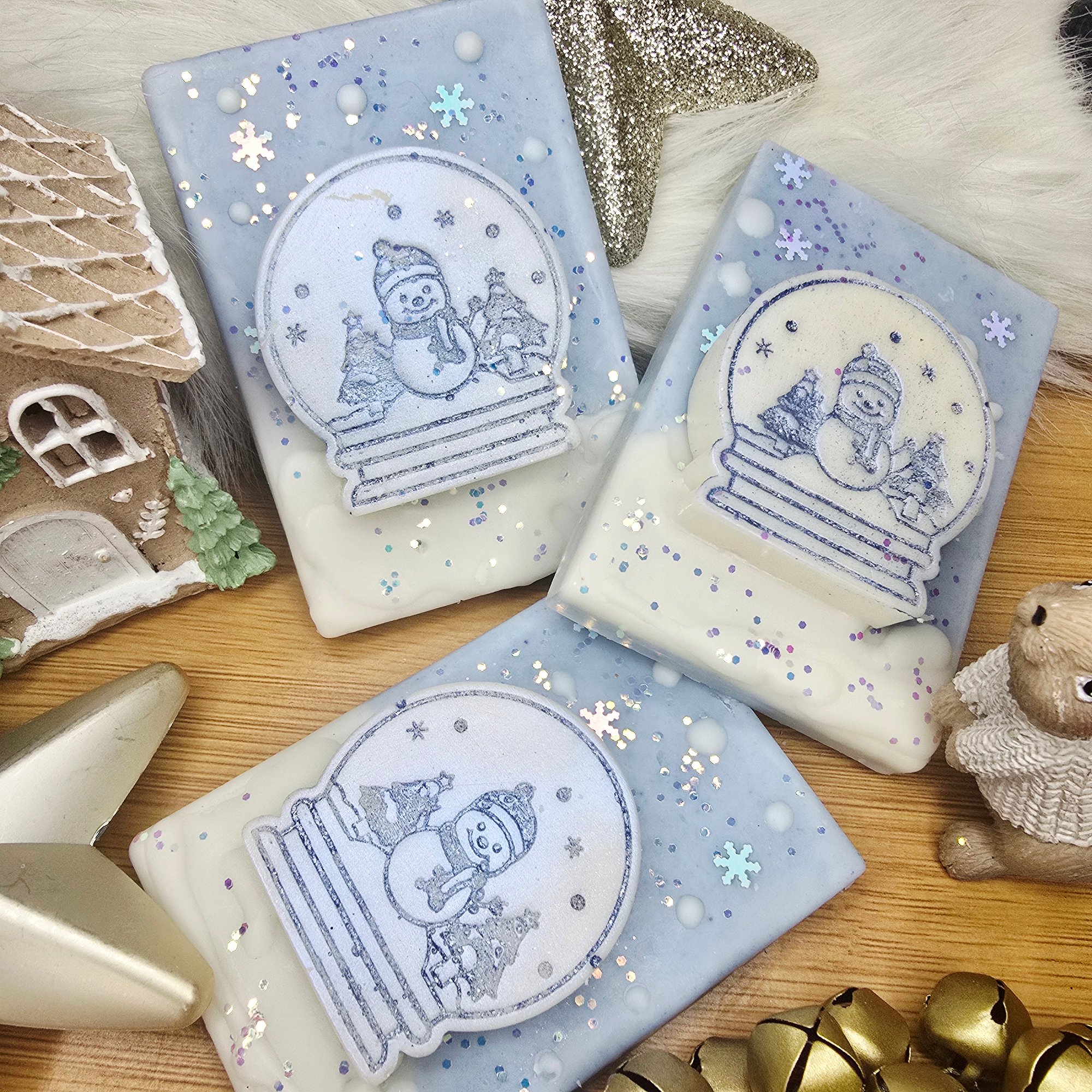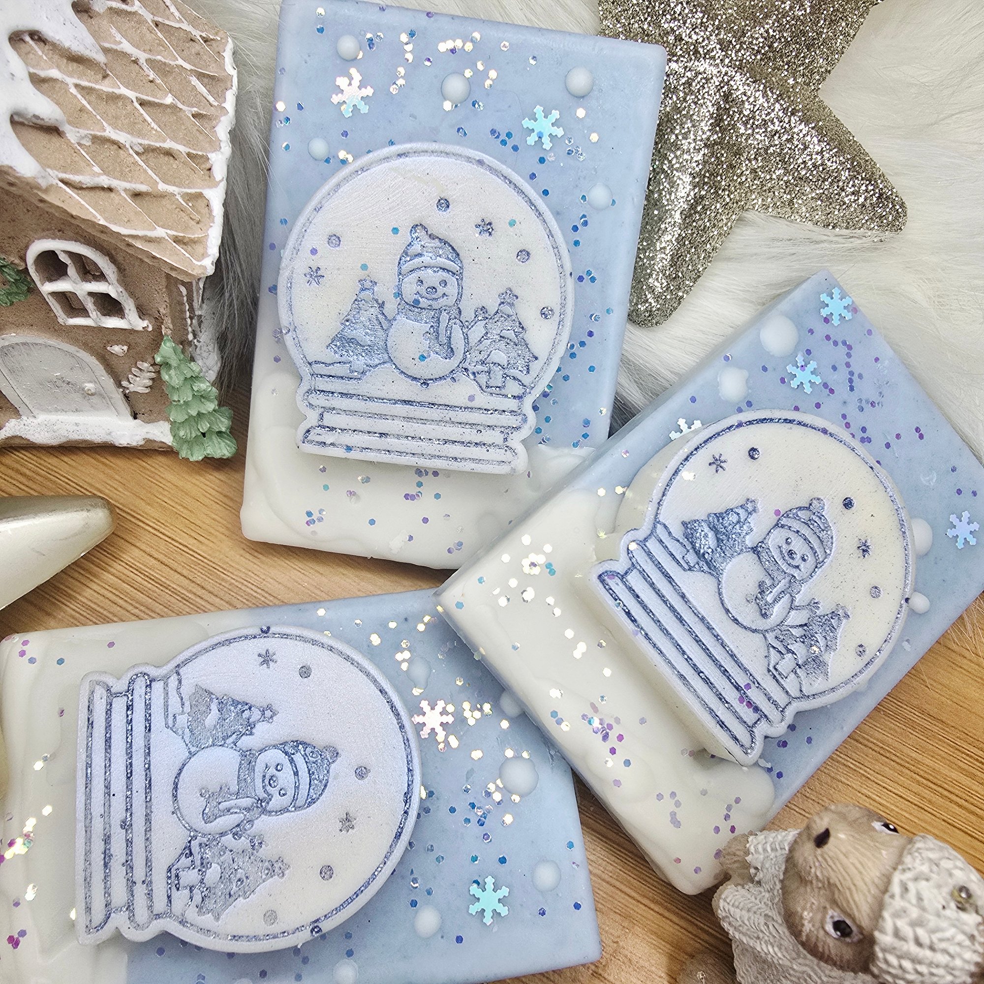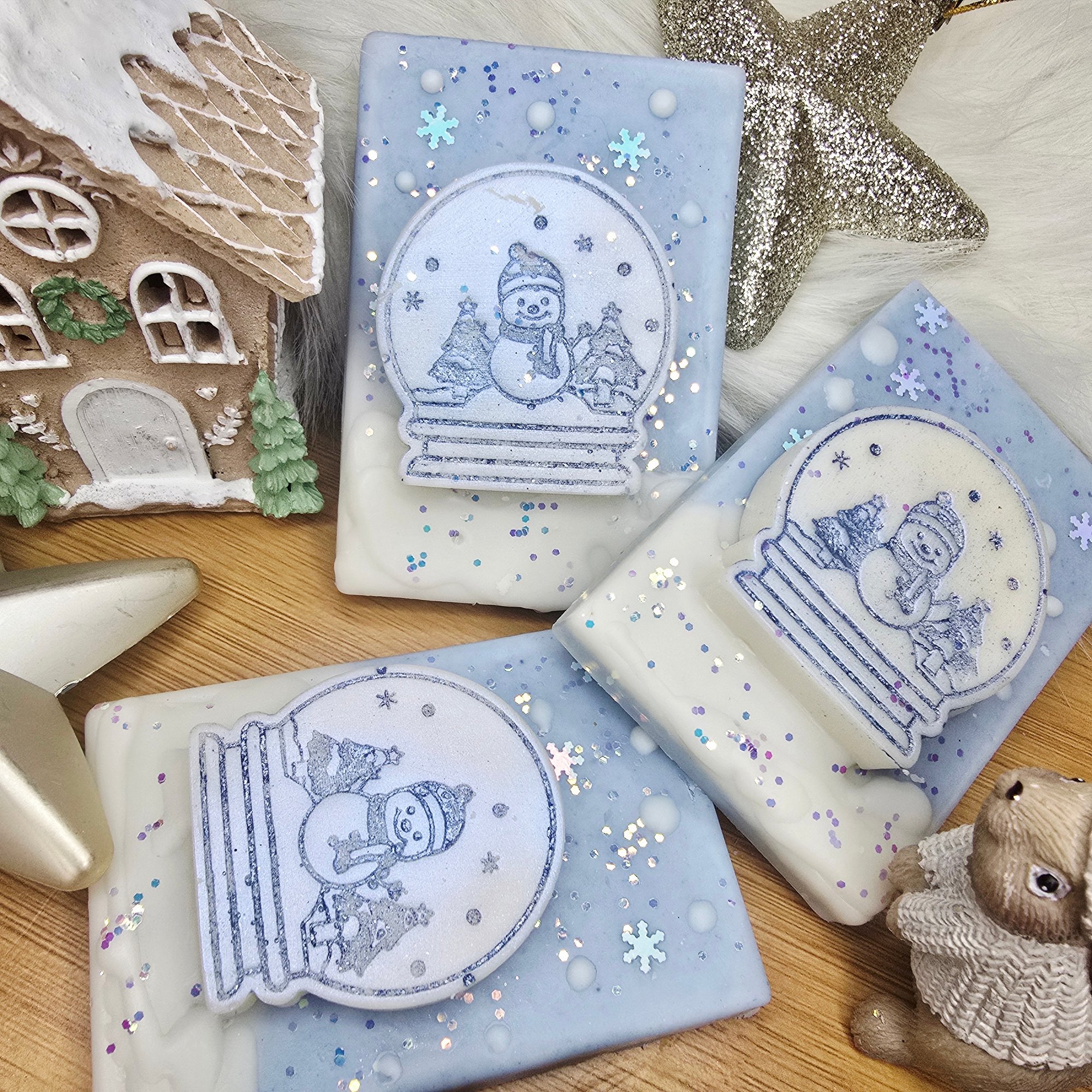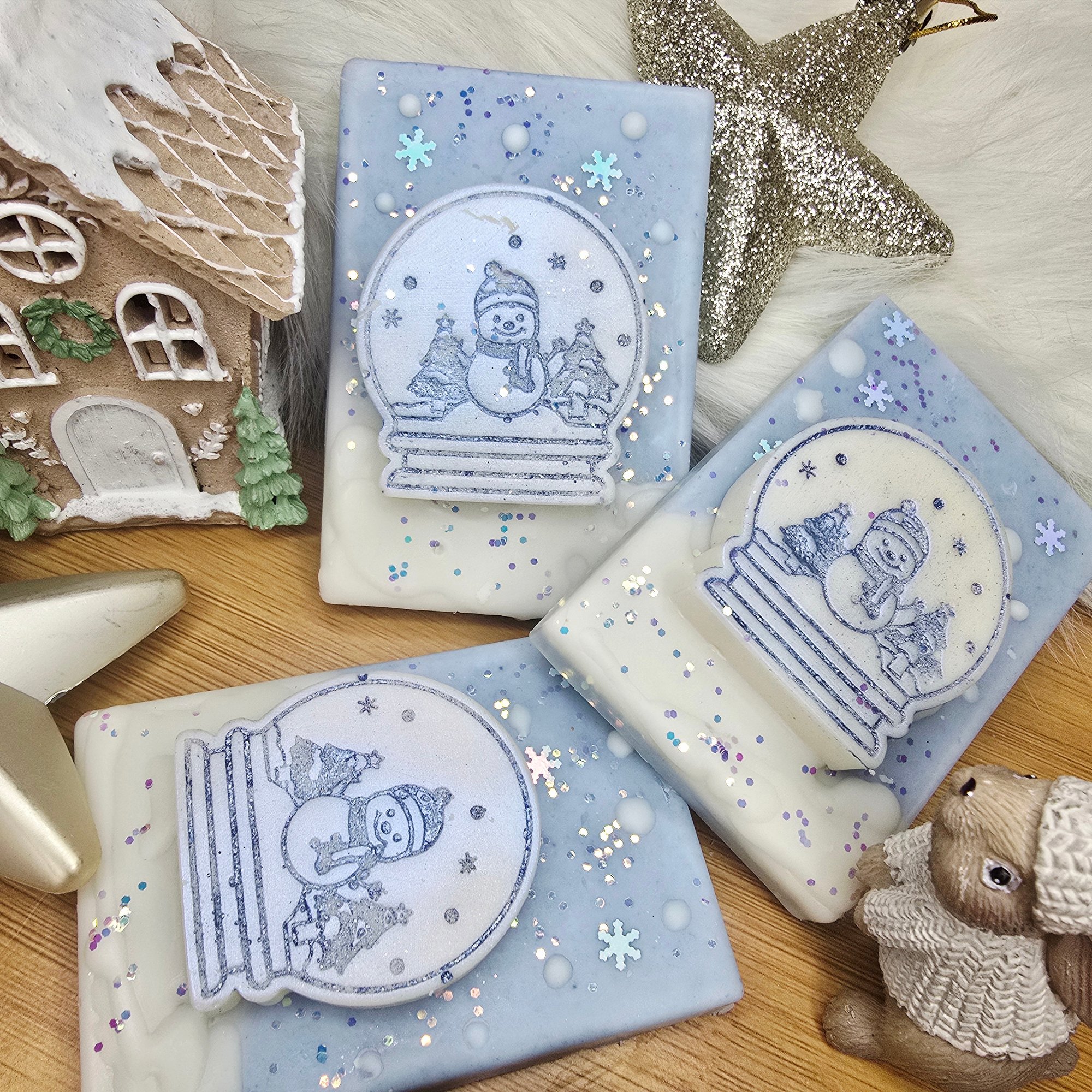 This adorable snowman snowglobe slab is in the scent Chilly Willy, A chilly sparkle of citrus cooled with frosty mint and crisp ozone shimmering. Floral accords of cyclamen amd jasmine compliment a base of sweet yummy vanilla, musks and glistening silver balsam.