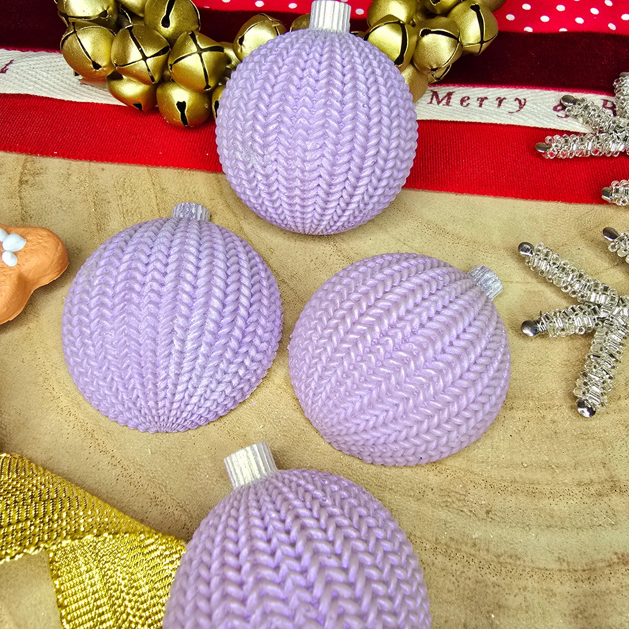 Knitted bauble duo from unorthodox moulds